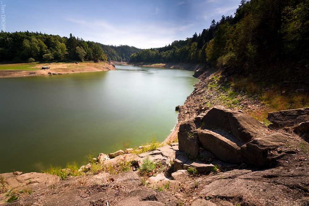 Kaňon Otavy pohledem ze soutokové skalky. Stráně se skálami a šumicími bory patří do rezervace Krkavčina.